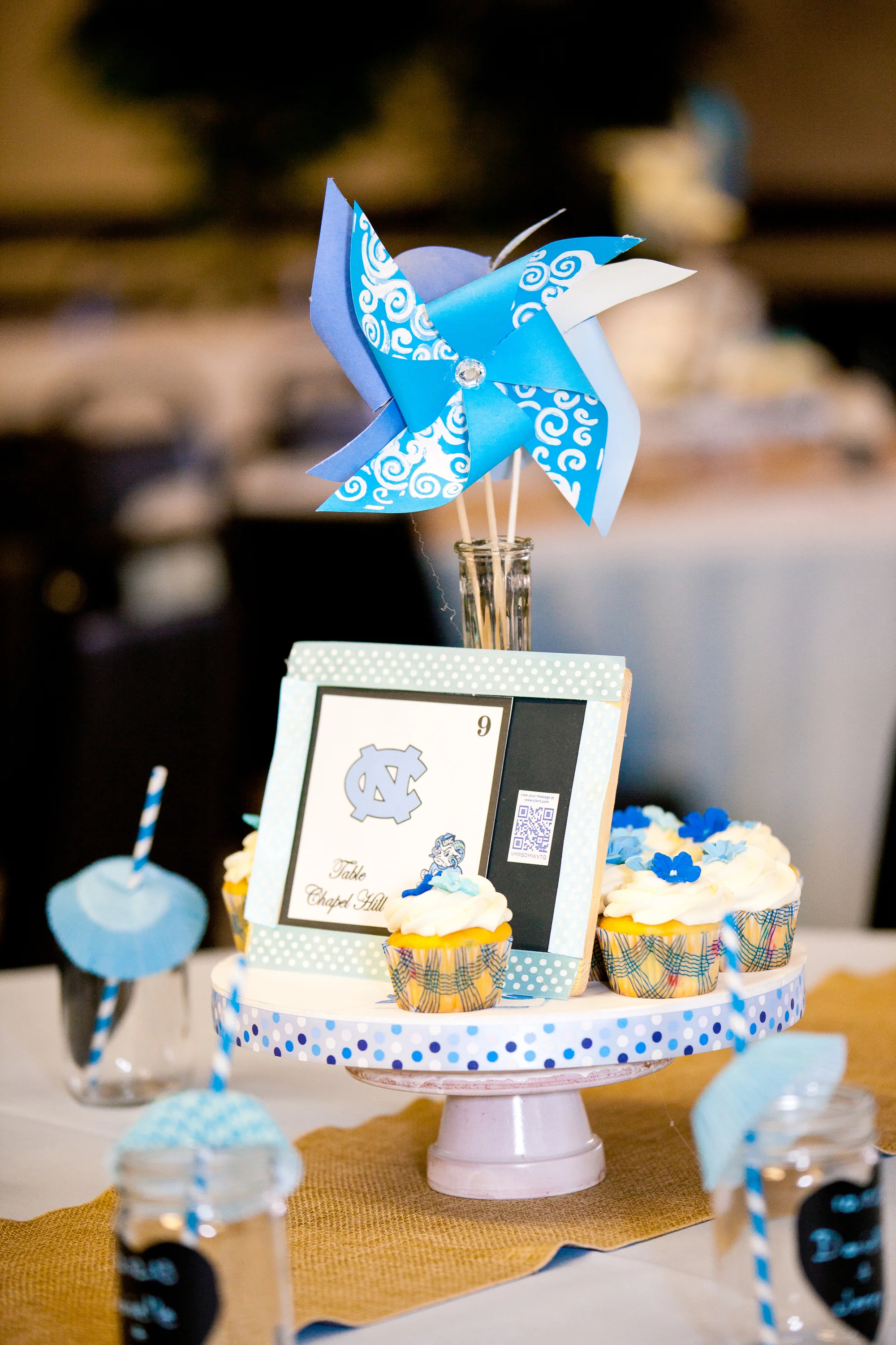 The centerpieces were also done completely by hand. These were flower pots spray painted white, topped with a styrofoam platform with ribbon hot glued to the outside. I used a stencil to paint flowers on the platforms. The platforms were topped with a vase with paper pinwheels and cupcakes.