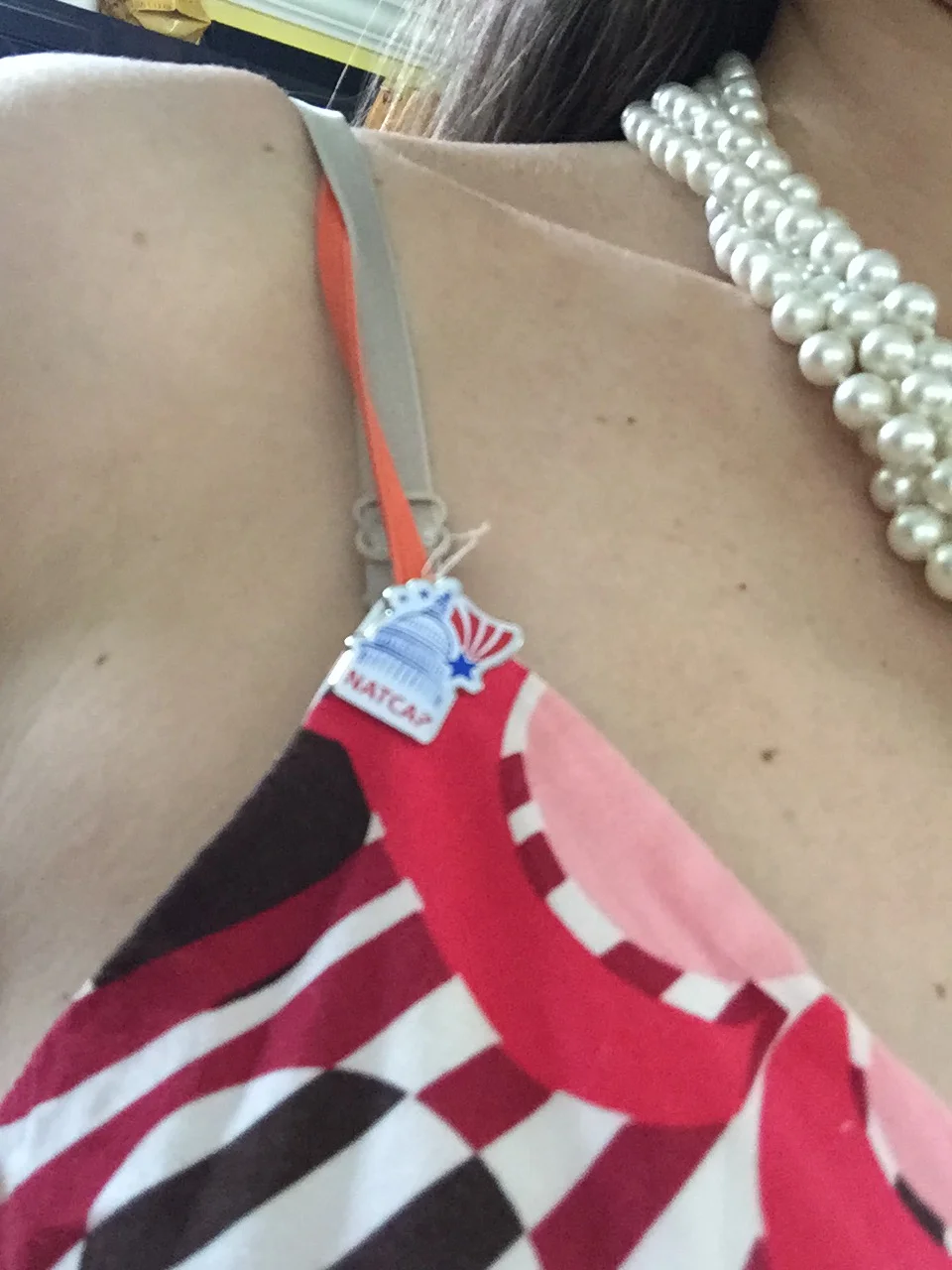 Quickly, I took the pin and pushed it through the top of my dress and through my strap.