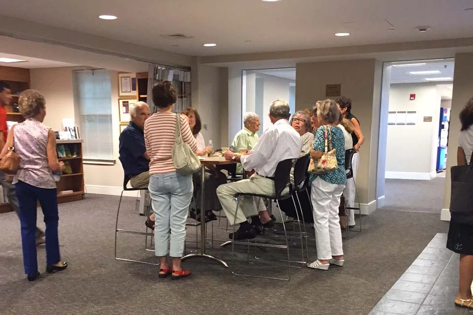 Mock jurors enjoying breakfast and coffee outside the bookstore at the School of Government prior to Defender Trial School (2015)