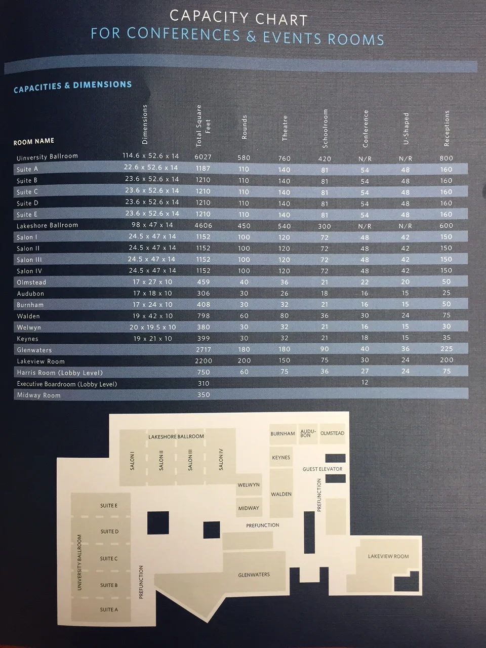 One other thing to consider is whether or not the charts include a projector and a stage. These things can take up space and change the capacity of the room. Having a 10 foot by 10 foot stage can eat up a lot of space fast. Also having room for a projector (front-facing or rear-facing) can be space intensive too. Rear projection is more space intensive than front projection, but has a more aesthetic look to it.